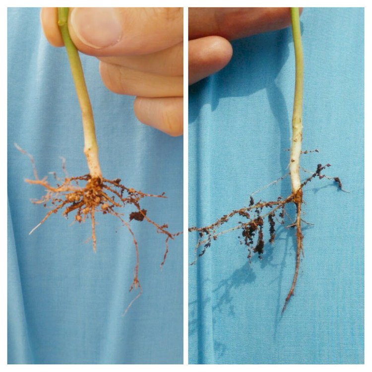 Raízes de feijoeiro com e sem rizóbio - Foto: Márcia Thaís/Embrapa